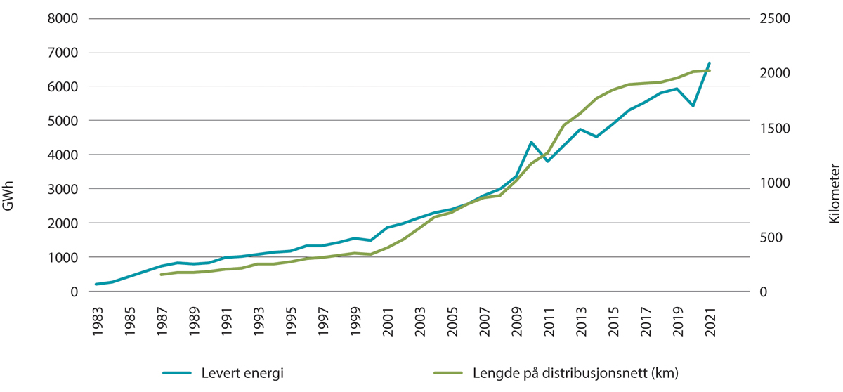 Figur 5.11 Utvikling i levert energi (GWh) og utstrekningen av ledningsnettet (km) for fjernvarme i Norge