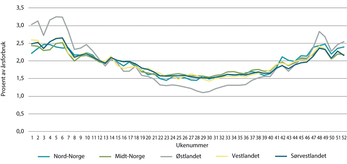 Som vist i kapittel 4 er en stor andel av oppvarmingen i Norge basert på elektrisitet. Dette gjør at elektrisitetsbruken påvirkes av været. Denne sammenhengen mellom utetemperatur og kraftbruk er sterkere i Norge enn i andre land. Figur 5.3 viser fordelingen av kraftbruken over året i prosent per uke i ulike områder i Norge.