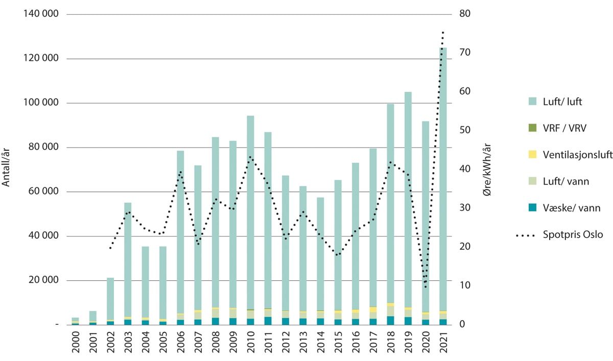 Figur 5.4 Salg av varmepumper i Norge (venstre akse) og spotpris Oslo (høyre akse). 2000-2021
