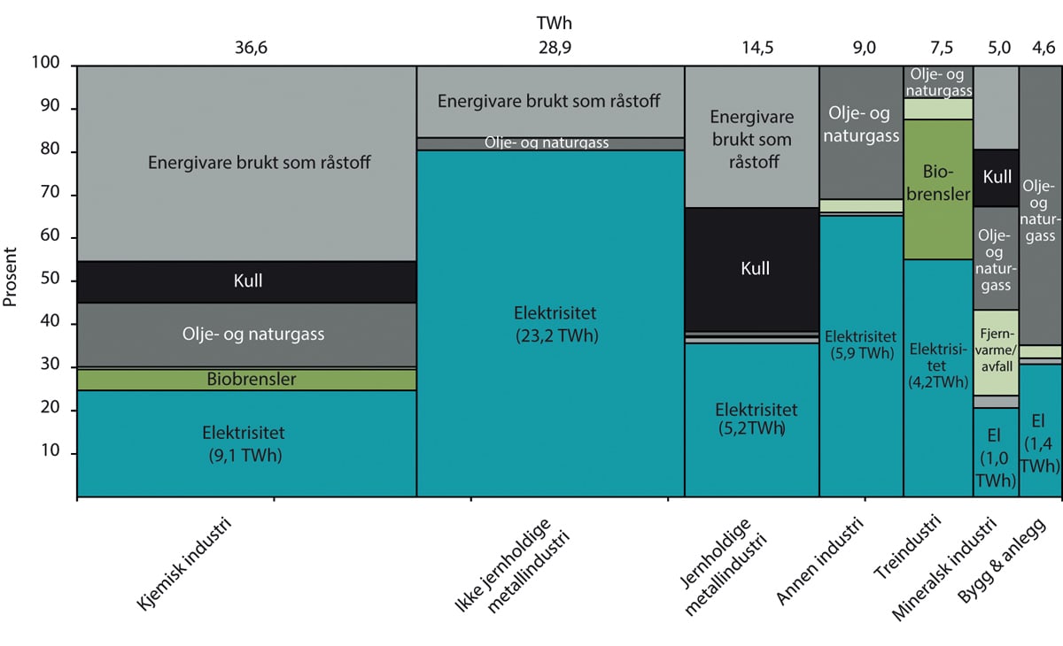 Energibruken i den landbaserte industrien er på rundt 112 TWh per år, inkludert energivarer brukt som råstoff til energiformål. Om lag 49 TWh av industriens energibruk er elektrisitet, mens 4 TWh er bioenergi og 0,6 TWh er fjernvarme.