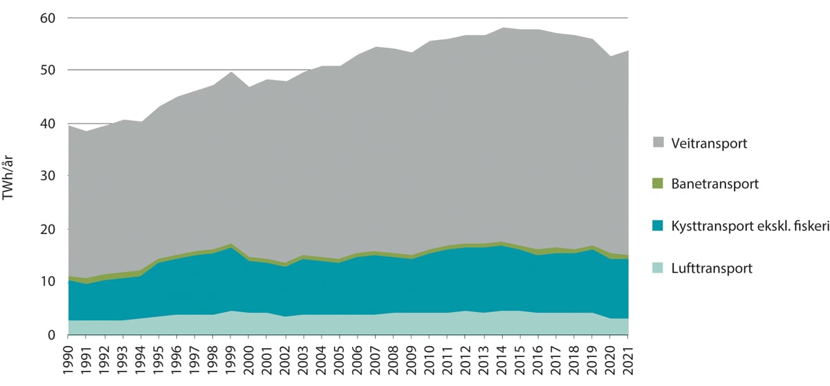 Veitransport står for rundt 70 prosent av energibruken i transportsektoren, etterfulgt av kysttransport på drøyt 20 prosent og lufttransport på ca. 7 prosent. Energibruken i veitransport har vokst mest siden 1990, fra 28-29 TWh til oppunder 40 TWh i dag. Kysttransport har hatt en svak vekst de siste 20 årene, mens energibruken i lufttransport har vært relativt stabil, med unntak av i 2021, da pandemien hindret reisevirksomhet.