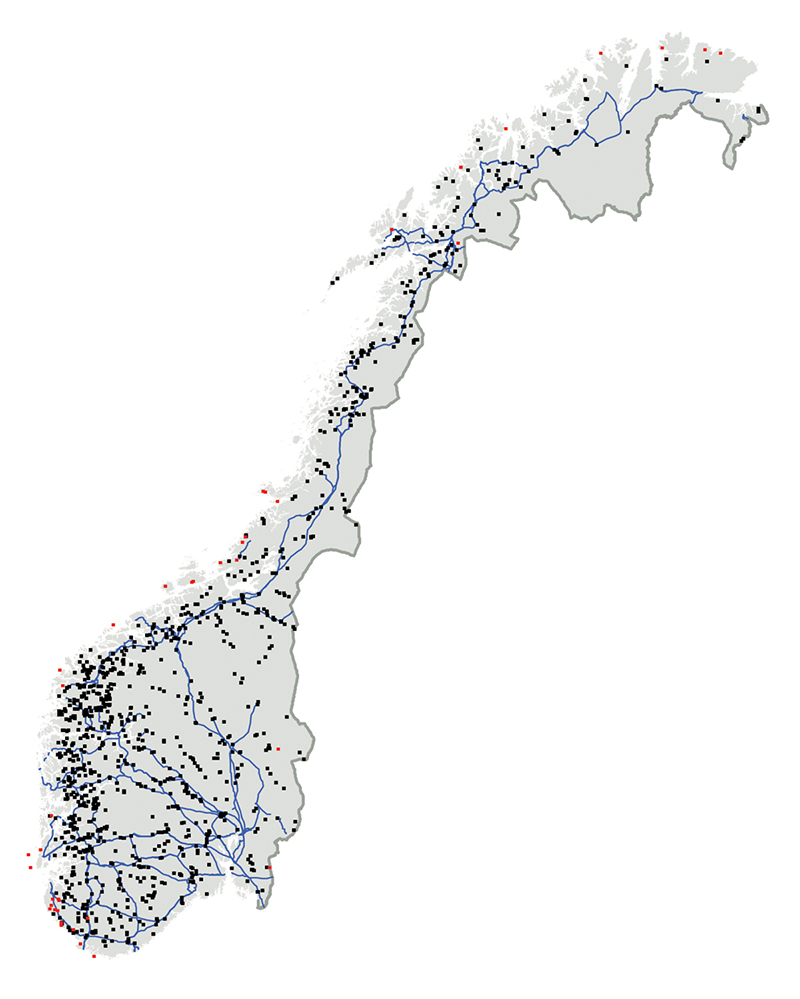 Figur 5.8 Vannkraftverk (svart prikk), vindkraftverk (rød prikk) og sentralnett (blå linjer) i Norge