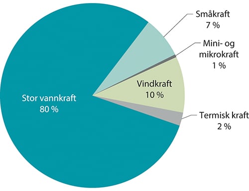 Vannkraften gir det største bidraget, med en årsproduksjon på 137,9 TWh fra 1739 kraftverk (per 1.1.2022) (NVE, 2022). Vindkraft er den nest største teknologien, med en årsproduksjon på 15,4 TWh, fordelt på 64 kraftverk og 1305 turbiner (NVE, 2022).
