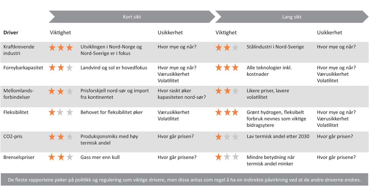 Analysemiljøene mener at norske myndigheter kan påvirke flere av driverne og bidra til å realisere ambisjoner og redusere usikkerhet. Konsesjonspolitikken er viktig og påvirker hvilke produksjonsteknologier som kommer, omfanget av utbygginger og hvor raskt det bygges. Hvordan vedtatte klimamål og klimaambisjoner følges opp med faktiske virkemidler og rammebetingelser er av stor betydning. I tabell 7.1 er viktighet og usikkerhet ved ulike drivere, på kort og lang sikt, oppsummert.