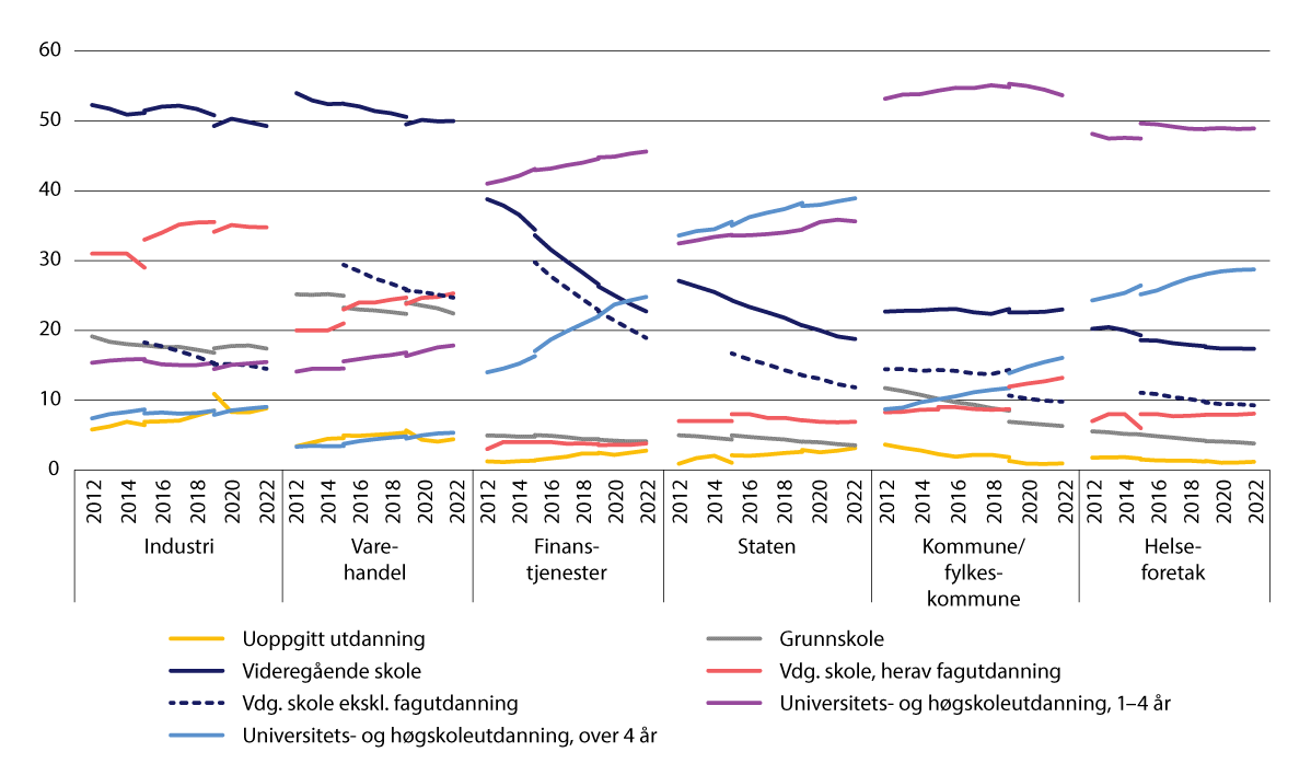 Figur 8.16 Ansatte fordelt etter utdanningsnivå. 2012–2022