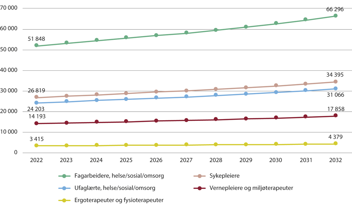 Med realistiske anslag for tilgjengelig og kvalifisert helsepersonell i årene fremover, beregner SSB at det vil være et underskudd på drøyt 14 000 årsverk i helse- og omsorgstjenestene i 2040 i scenarioet for lav vekst, mens underskuddet beregnes til nesten 70 000 årsverk i 2040 i scenarioet for middels vekst. Underskuddet blir over 120 000 årsverk i 2040 i scenarioet for høy etterspørselsvekst. Det er særlig sykepleiere og helsefagarbeidere det blir mangel på.