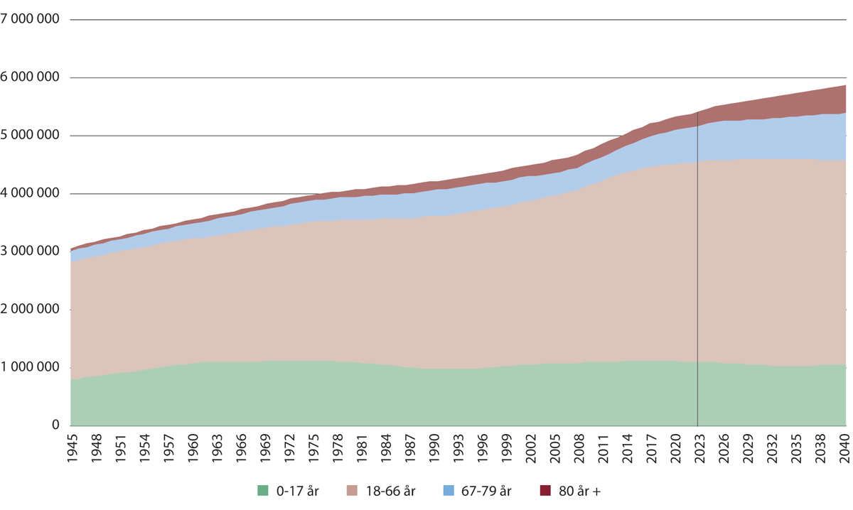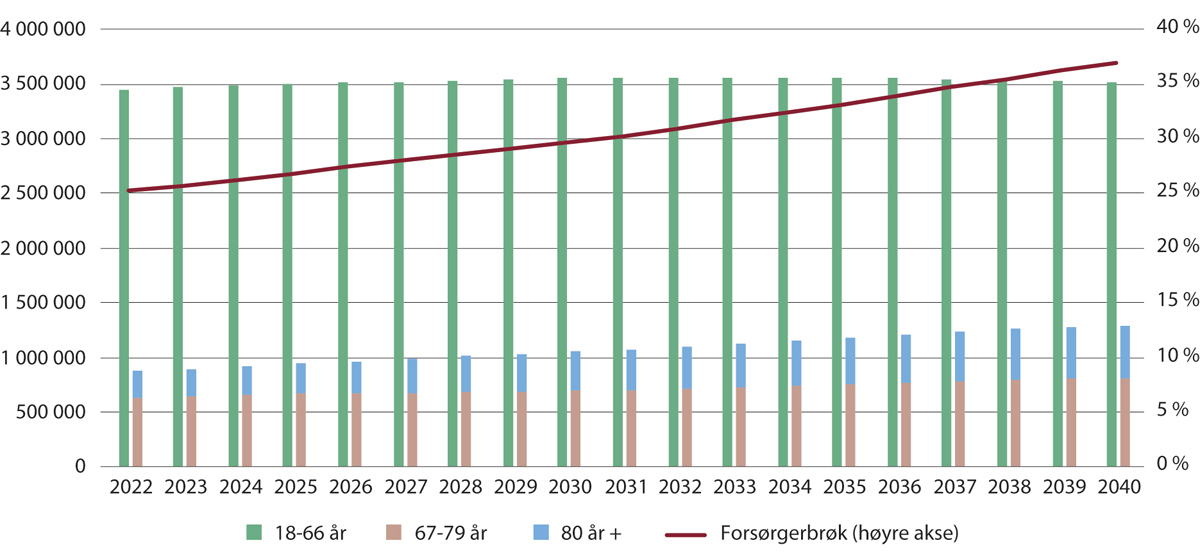 Som i andre europeiske land, går Norge mot et økt antall eldre, mens antallet i yrkesaktiv alder stagnerer og forventes å gå ned midt på 2030-tallet, slik at forsørgerbrøken øker fra rundt 25 prosent i 2022 til 37 prosent i 2040.