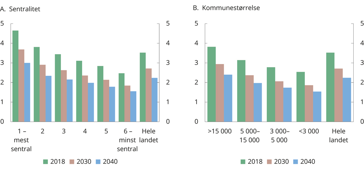 Figur 2.14 Forsørgelsesrate (antall sysselsatte i alderen 20–74 år per pensjonist over 67 år) i ulike kommuner, etter sentralitet og størrelse.