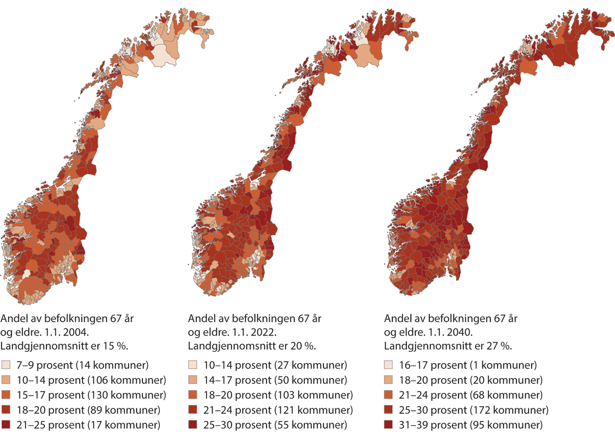 Veksten i eldre innbyggere vil variere mellom kommuner og regioner, og SSBs befolkningsfremskrivinger viser at aldringen vil skje raskere i mindre sentrale deler av landet. SSB omtaler utviklingen som «voksende byer og aldrende bygder» (Leknes og Løkken 2020). I 2040 vil mer enn hver tredje innbygger i en del distriktskommuner være over 70 år i SSBs hovedalternativ (Perspektivmeldingen 2021, s. 240).