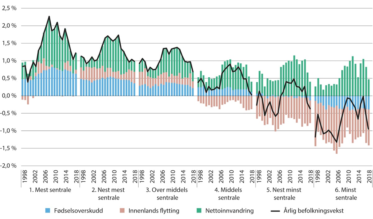 Figur 2.16 Årlig befolkningsutvikling i prosent, dekomponert etter fødselsoverskudd, innenlands flytting og nettoinnvandring, fordelt på sentralitetsklasser. 1998–2018