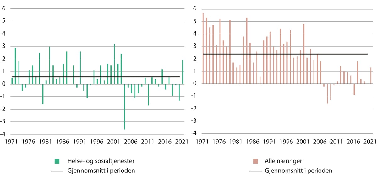 Figur 2.17 viser produksjon per utførte timeverk, også kalt arbeidsproduktivitet, for hvert år beregnet som endring fra året før. Helse- og omsorgstjenester omfatter helsenæringene og omsorgsnæringene i markedsrettet, ideell, kommunal og statlig sektor. Produksjon omfatter produksjonsaktivitet registrert under helse- og omsorgstjenester. Arbeidsproduktivitet er utviklingen i produksjonen av tjenestene i forhold til personellinnsatsen som benyttes. Som det går frem av figuren, varierer produktiviteten betydelig fra år til år, men det er en viss fallende tendens over de 50 årene figuren viser utviklingen for. Produktiviteten innen helse- og omsorgstjenester er vesentlig lavere enn produktiviteten for hele økonomien som helhet. Gjennomsnittet av de årlige vekstratene over perioden for alle næringer er 2,4 prosent, mens gjennomsnittlig årlig produktivitetsvekst for helse- og omsorgstjenester er i underkant av 0,6 prosent. Theie mfl. (2017) fant en gjennomsnittlig produktivitetsvekst i helsesektoren på 0,32 prosent i perioden fra 2005 til 2014, et bilde som er konsistent med figur 2.17.