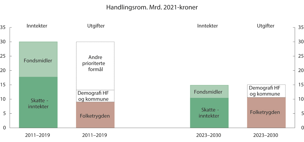 Inntektene fra Statens pensjonsfond utland har spilt en viktig rolle i Norge de siste 20 årene. Fra fondet ble etablert i 2001 og frem til 2019 har veksten i fondsmidler innenfor handlingsregelen brukt i statsbudsjettet økt med gjennomsnittlig 12 milliarder kroner hvert år (Perspektivmeldingen 2021). Figur 2.18 viser dette finansielle handlingsrommet. I perioden 2023–2030 anslås årlig vekst i fondsmidler med en nøytral finanspolitikk å ligge på mellom 3–6 milliarder 2021-kroner, et beløp som i sin helhet tenkes brukt på å dekke anslåtte økte utgifter i helseforetakene og kommunesektoren som følger av demografiutviklingen. Dette medfører at Stortingets budsjettmessige handlingsrom endres. Det vil ikke være anledning til å finansiere nye satsinger på statsbudsjettet som ikke kompenseres av tilsvarende kutt i andre poster.