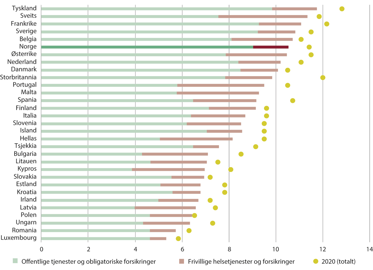 Den norske andelen er omtrent på nivå med den svenske andelen og noe høyere enn den danske andelen. Helseutgifter som andel av BNP er høyere enn i Norge i henholdsvis fem og seks land i 2019 og 2020. Hvis man kun ser på utgifter til offentlige tjenester (government health schemes) og obligatoriske forsikringer (offentlige eller private), og holder utgifter til frivillige private helsetjenester («out-of-pocket») og frivillige helseforsikringer utenfor, er andelen høyere i henholdsvis tre og fire land i 2019 og 2020.