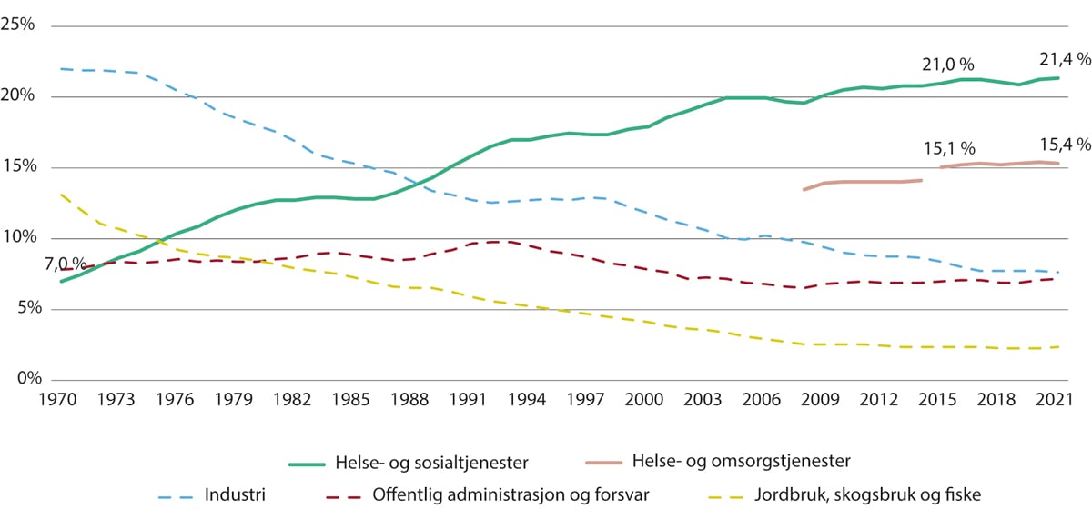 Sysselsettingen i helse- og sosialtjenestene har økt sterkt siden 1970, da andelen i disse næringene var på sju prosent. Andelen hadde økt til drøyt 21 prosent i 2021. Merk at dette er inkludert sosialtjenester uten omsorgspreg, herunder barnehager, men det er uansett hevet over tvil at helse- og omsorgstjenestene har økt sin andel betraktelig i en periode der demografisk utvikling ikke alene kan forklare økningen. Fra 2008 har SSB tall for helse- og omsorgstjenestene, som holder sosialtjenester uten omsorgspreg utenfor. Denne andelen var drøyt 15 prosent i 2021 (økningen fra 2014 til 2015 henger sammen med ny metode for datainnsamling). Figur 2.2 viser at den økte sysselsettingen i helse- og sosialtjenestene har funnet sted i en periode der andelen har blitt redusert i industrien og jordbruk, skogsbruk og fiske.