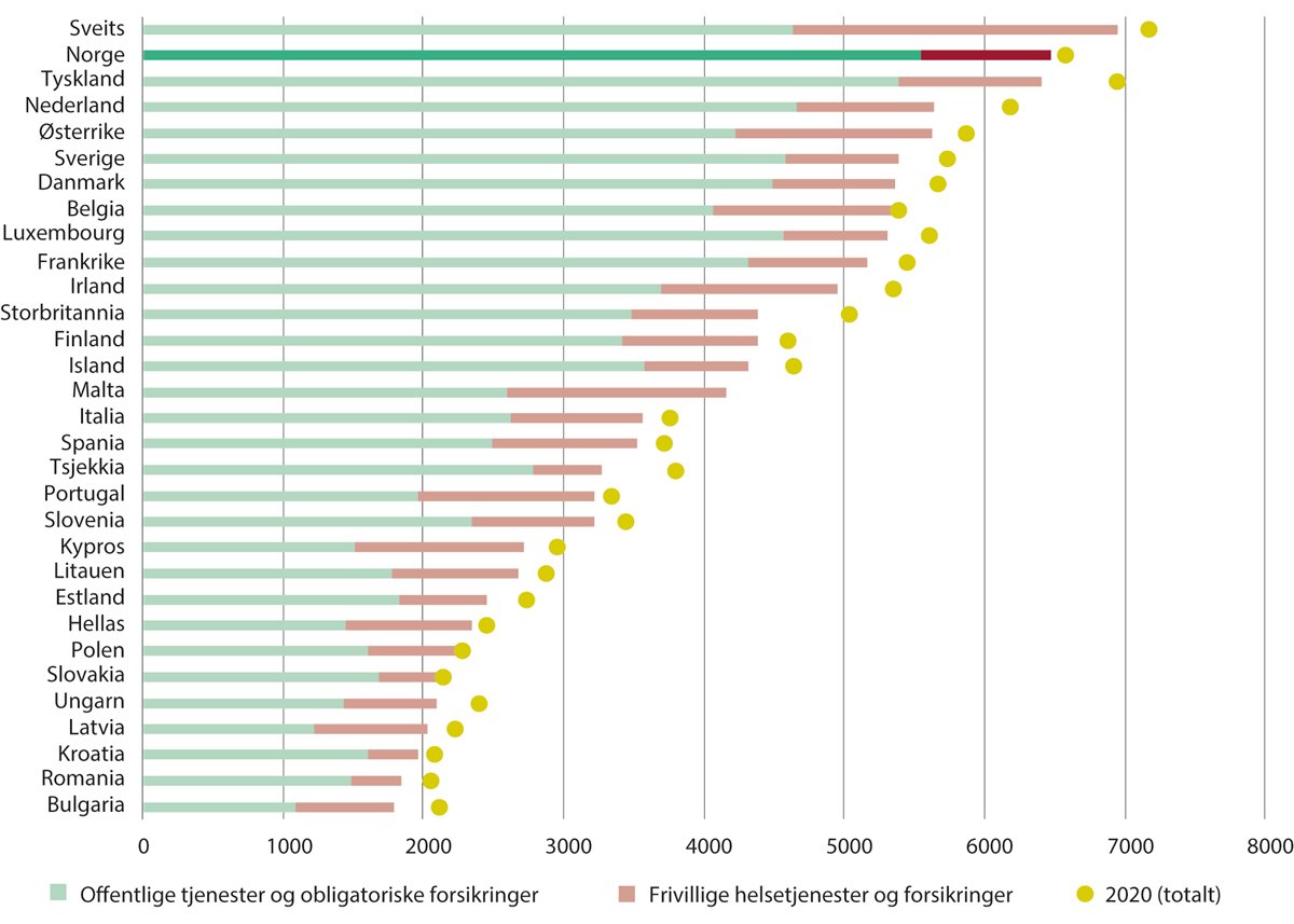 Ser man kun på utgifter til offentlige tjenester og obligatoriske forsikringer, og holder utgifter til frivillige private helsetjenester og frivillige helseforsikringer utenfor, var det ingen av disse landene som hadde høyere helseutgifter per innbygger enn Norge i 2019, og kun Tyskland i 2020.