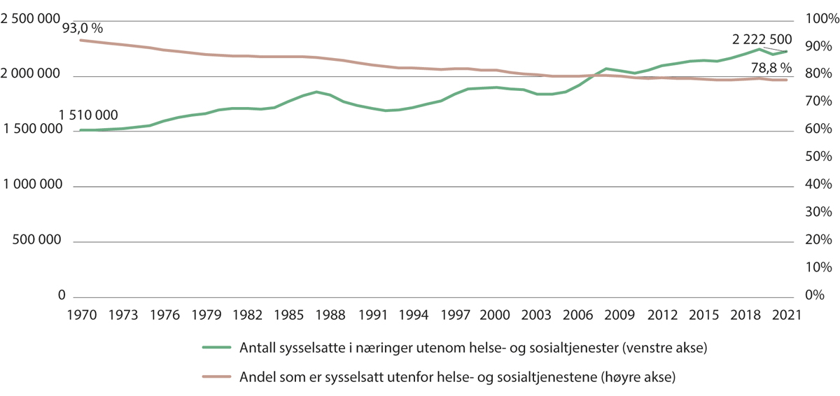 Figur 2.3 Antall og andel sysselsatte i andre næringer enn helse- og sosialtjenester. 1970–2021