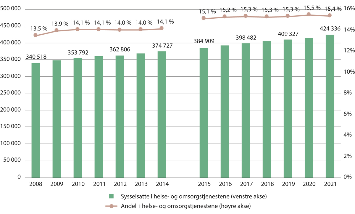 Andelen som jobber i helse- og omsorgstjenestene i Norge har økt over tid, men siden 2008 har utviklingen vært relativ svak. I 2008 var andelen 13,5 prosent, og i 2021 var andelen 15,4 prosent, men deler av økningen mellom 2014 og 2015 kan trolig tilskrives ny metode for datainnsamling. Det har vært et økt antall sysselsatte i helse- og omsorgstjenestene hvert år siden 2008, slik det går frem av figur 2.4. Det har stort sett vært en vekst i antallet sysselsatte også i øvrige næringer, men sysselsettingen falt i 2009 (finanskrisen), 2015 (oljeprisfallet) og 2020 (koronapandemien). Det har ført til en økning i andelen som er sysselsatt i helse- og omsorgstjenestene.