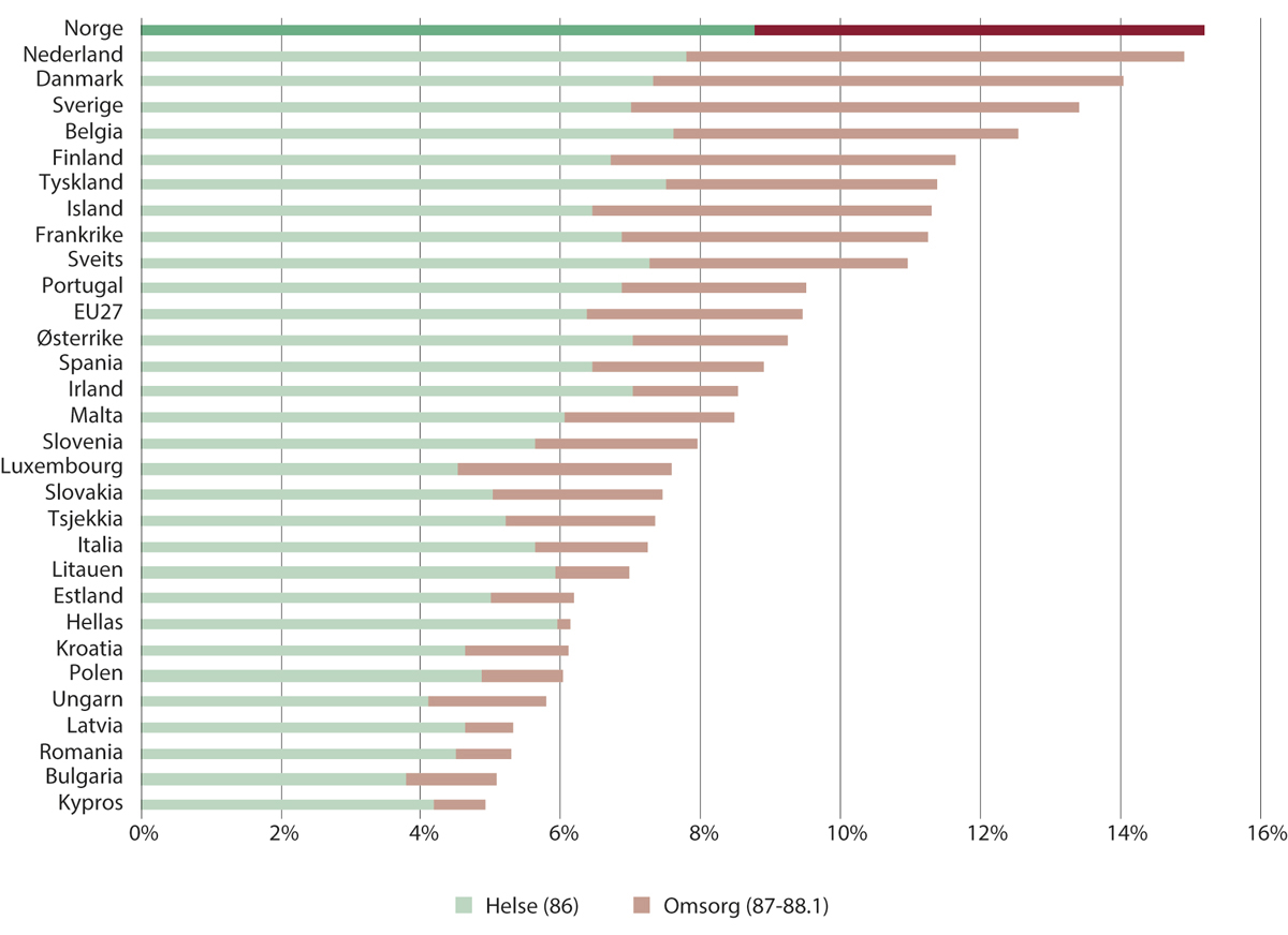 Statistikk fra Eurostat i figur 2.5 viser at Norge er det EØS-landet som har den høyeste andelen av de sysselsatte innen helse- og omsorgstjenester. Andelen på 15 prosent er klart høyere enn EØS-snittet, som ligger i underkant av ti prosent, og den er også høyere enn våre skandinaviske naboland, som følger på plassene etter Norge og Nederland. Andelen i Norge er 0,3 prosentpoeng høyere enn i Nederland, 1,2 prosentpoeng høyere enn i Danmark og 1,8 prosentpoeng høyere enn i Sverige.