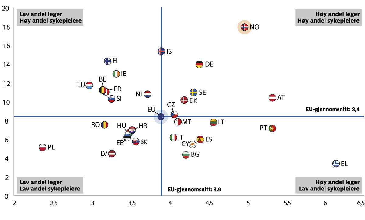 Figur 2.6 viser at Norge har den høyeste dekningen av sykepleiere pr. 1 000 innbyggere i EØS-området og at vi er blant landene med høyest dekning av leger pr. 1 000 innbyggere (tallene for Portugal og Hellas, som har en høyere andel leger enn Norge i figuren, inkluderer alle autoriserte leger, og ikke kun praktiserende leger, og er derfor ikke direkte sammenlignbare).