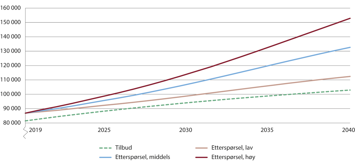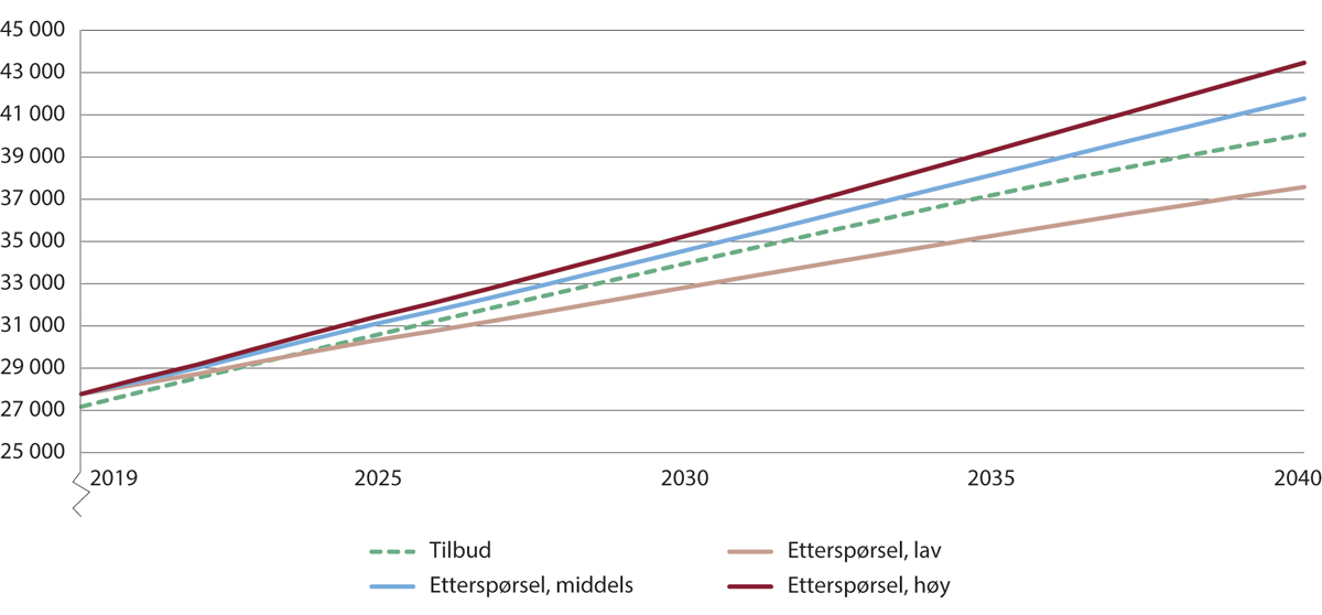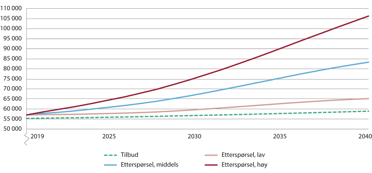 Denne sterke veksten i arbeidstilbudet er imidlertid ikke nok til å kompensere for etterspørselsveksten. Figur 2.8 illustrerer den sterke økningen i etterspørselen av i alle de tre etterspørselsalternativene. I alternativet for lav vekst forventes det en økning i etterspørselen etter sykepleiere på over 25 000 årsverk mellom 2019 og 2040. I mellomalternativet blir økningen i etterspørselen på nesten 46 000 årsverk, mens det beregnes en økning i etterspørselen på hele 66 000 årsverk i alternativet for høy etterspørselsvekst over perioden.