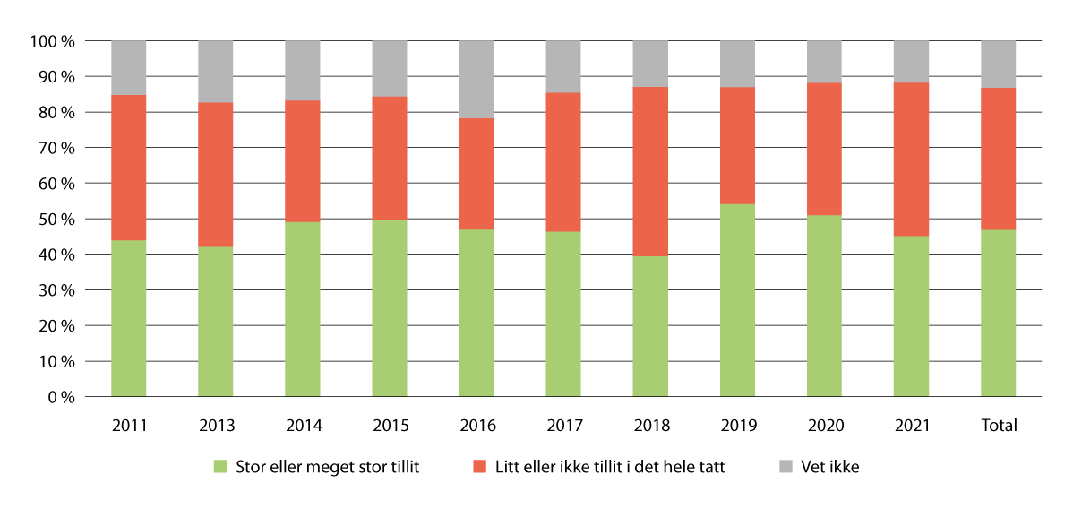 Spørsmålet de har svart på er: «Hvor stor eller liten tillit har du til de følgende institusjonene?»