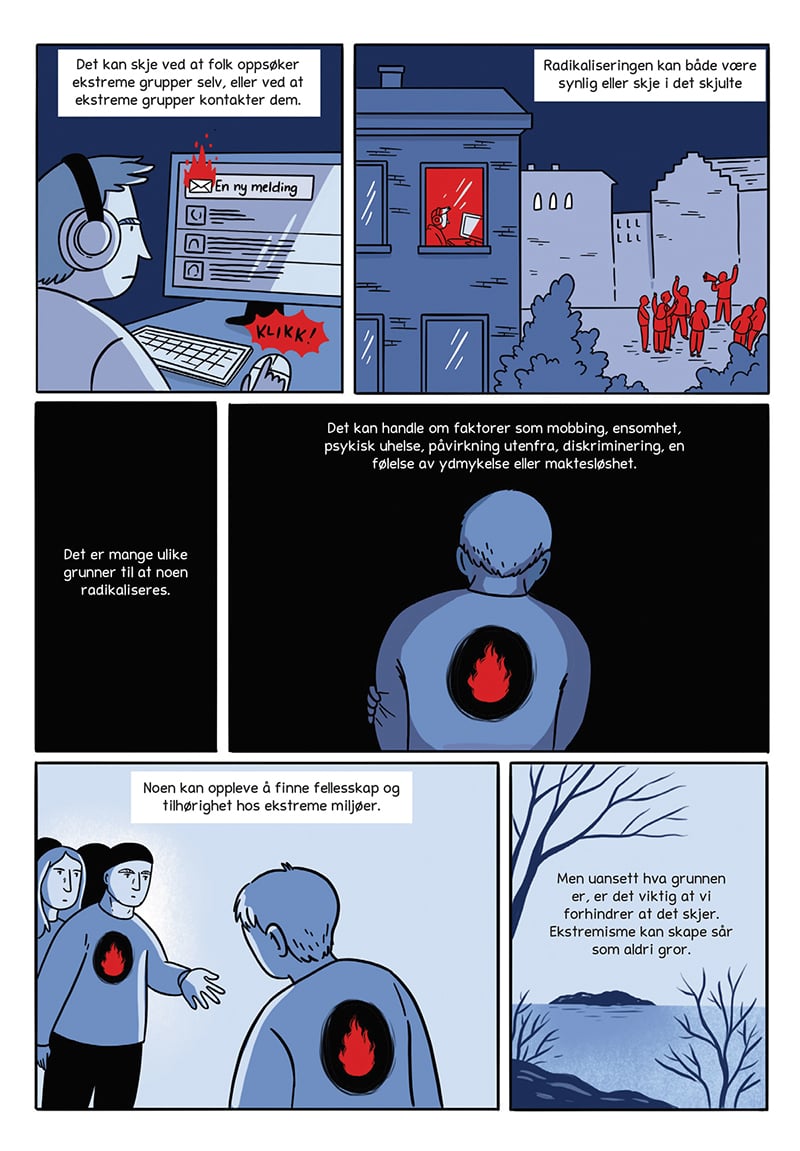Kommisjonens saksgjennomgang bekrefter at mange av dem som radikaliseres til voldelig ekstremisme ikke mestrer skolen, har løs tilknytning til arbeidslivet og sliter med andre sosiale og økonomiske utfordringer. Det er mange som har vokst opp med en for dårlig omsorgssituasjon, og flere er utsatt for vold. Slike erfaringer kan gjøre enkeltmennesker mer sårbare for påvirkning fra ekstremistiske grupper som tilbyr et fellesskap, og som fremmer hat eller rettferdiggjør vold. Samtidig blir de aller fleste som har slike livserfaringer aldri ekstremister.