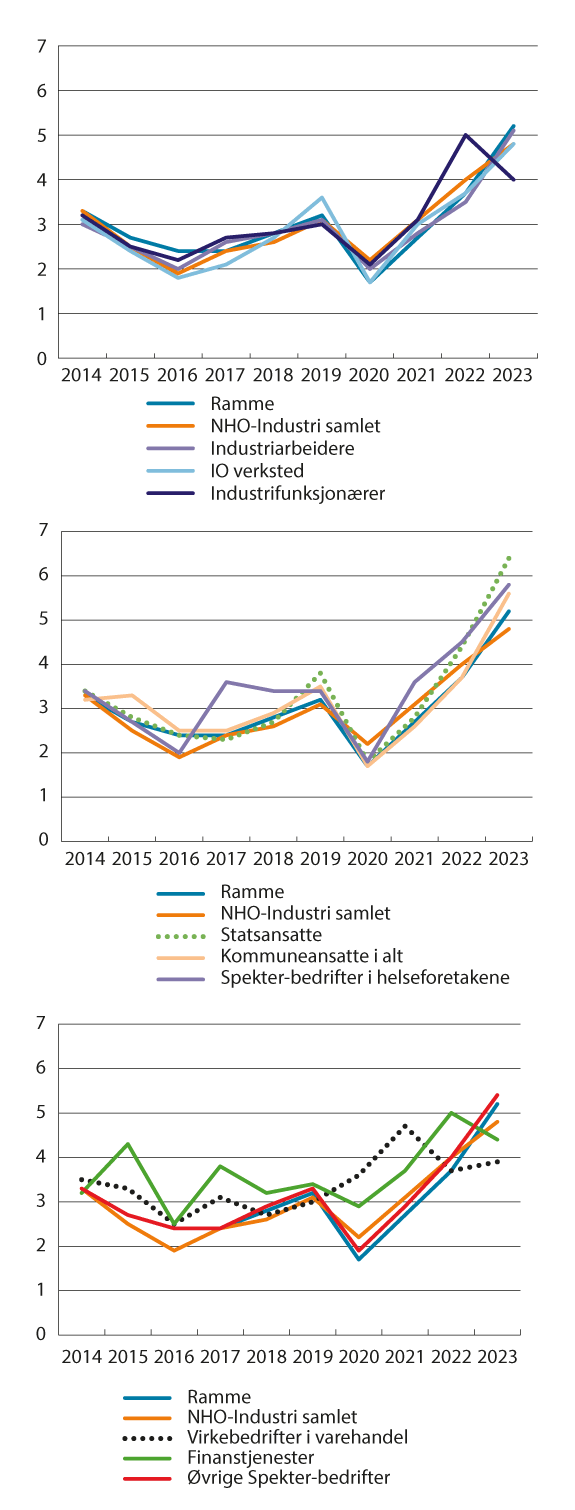 Generelt må det forventes avvik mellom rammen som anslått i oppgjørene og den realiserte årslønnsveksten. Vurderingene rundt rammen foretas vanligvis på våren under usikkerhet om utviklingen i arbeidsmarkedet og bedriftenes økonomiske situasjon resten av året, og dermed om resultatene av lokale forhandlinger og annen lønnsglidning. Vurderinger rundt rammen i mellomoppgjøret i 2023 er gjengitt i boks 1.1 i vedlegg 1.
