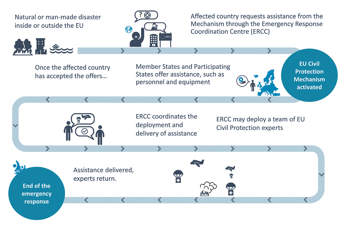 Figur 13.1 viser prosessen knyttet til bruk av ordningen. Et deltakerland kan be om bistand via ERCC. Deretter koordineres arbeidet med å stille relevante ressurser til rådighet, som igjen vil bli formidlet til det berørte landet – gitt at det berørte landet aksepterer de tilbud om bistand som blir gitt. Ordningen bygger slik sett på frivillig koordinering av kollektive ressurser til bruk i en krisesituasjon eller annen truende hendelse.