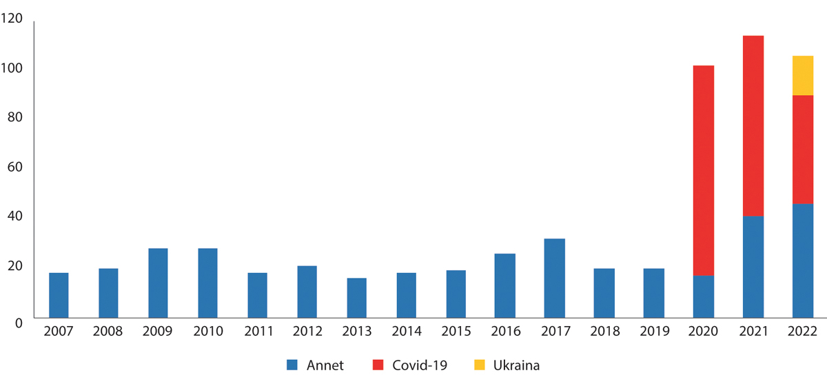 Det er også interessant å se nærmere på under hva slags type kriser/truende hendelser EUs ordning for sivil beredskap er aktivert. Figur 13.3 viser at perioden 2007–2019 samlet sett domineres av respons på naturskapte kriser/hendelser, som jordskjelv, skogbranner, oversvømmelser og annet ekstremvær. Perioden 2020–2022 preges i stor grad av covid-19 som en global helsetrussel, og relaterte aspekter (som for eksempel konsulær bistand til EU-borgere som ble «strandet» i land utenfor EU). I tillegg fikk en menneskeskapt krise – krigen i Ukraina – en sentral rolle i EUs samarbeid, på grunnlag av både omfang og alvorlighetsgrad. I løpet av de siste tjue årene – og særlig de ti siste – har dermed samarbeidet om sivil beredskap og krisehåndtering fått en mer framtredende rolle i EU.