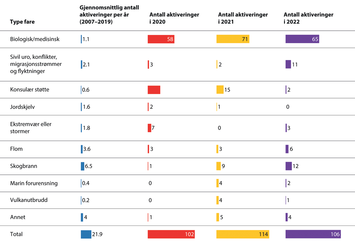 Figur 13.3 Aktivering av EUs ordning for sivil beredskap 2007–2022 – fordelt etter type fare/trussel. Antall aktiveringer.