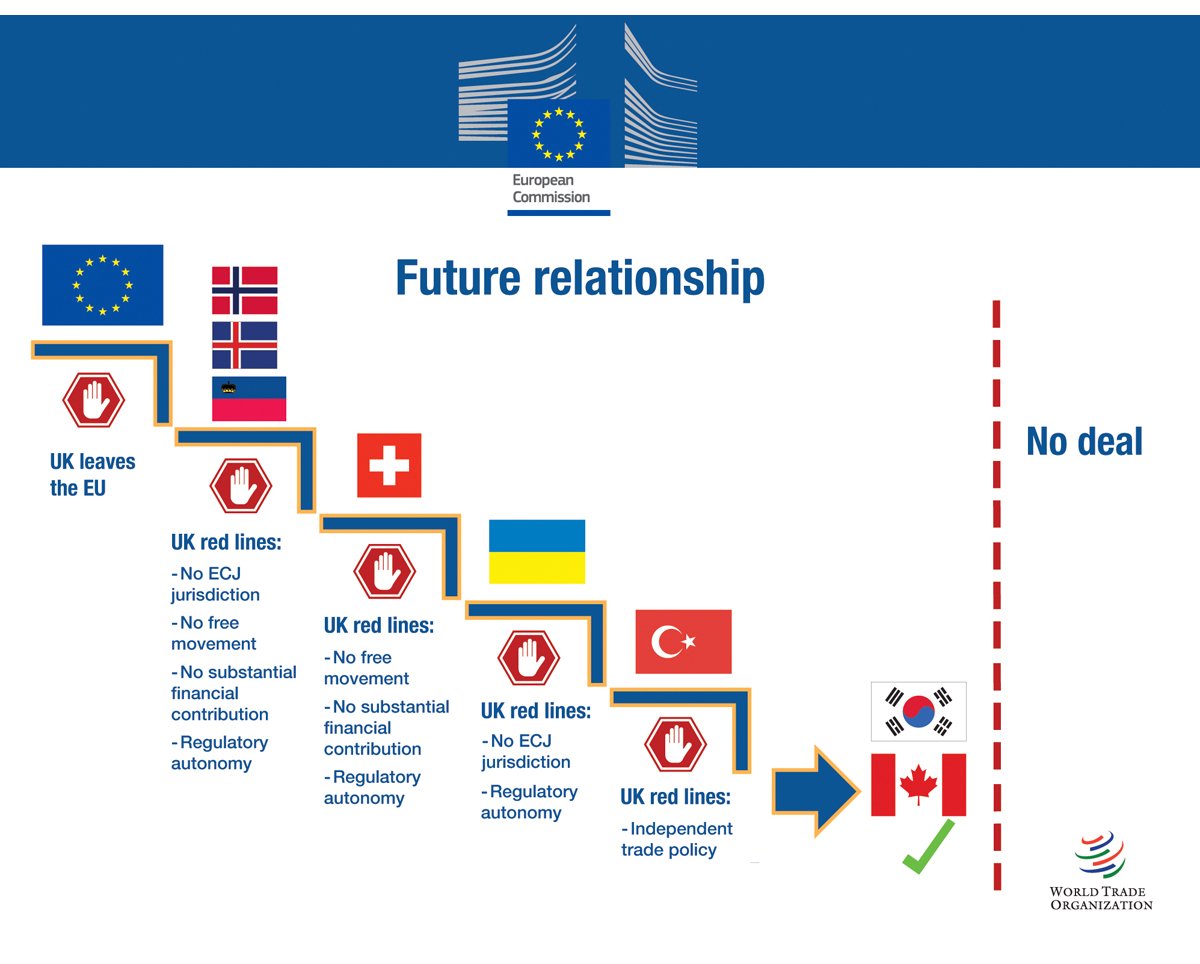 Det europeiske råd EUs stats- og regjeringssjefer) fastsatte de sentrale prinsippene for et framtidig samarbeid kort tid etter at Storbritannia formelt startet utmeldingsprosessen. Et minstekrav var at et ikke-medlem som ikke oppfylte de samme forpliktelsene som EUs medlemsstater, ikke kunne få samme rettigheter og fordeler som medlemsstatene.49 Et annet sentralt prinsipp er at land som ønsker å inngå avtaler med EU, ikke kan «velge og vrake» i tilgang til det indre marked eller øvrig politikk. Med andre ord, kompromisser når det gjaldt fri bevegelighet av personer, var aldri aktuelt. Britisk avvisning av EU-domstolens myndighet og kravet om å kunne føre en uavhengig handelspolitikk, innebar at en frihandelsavtale gjensto som det eneste mulige alternativet.50