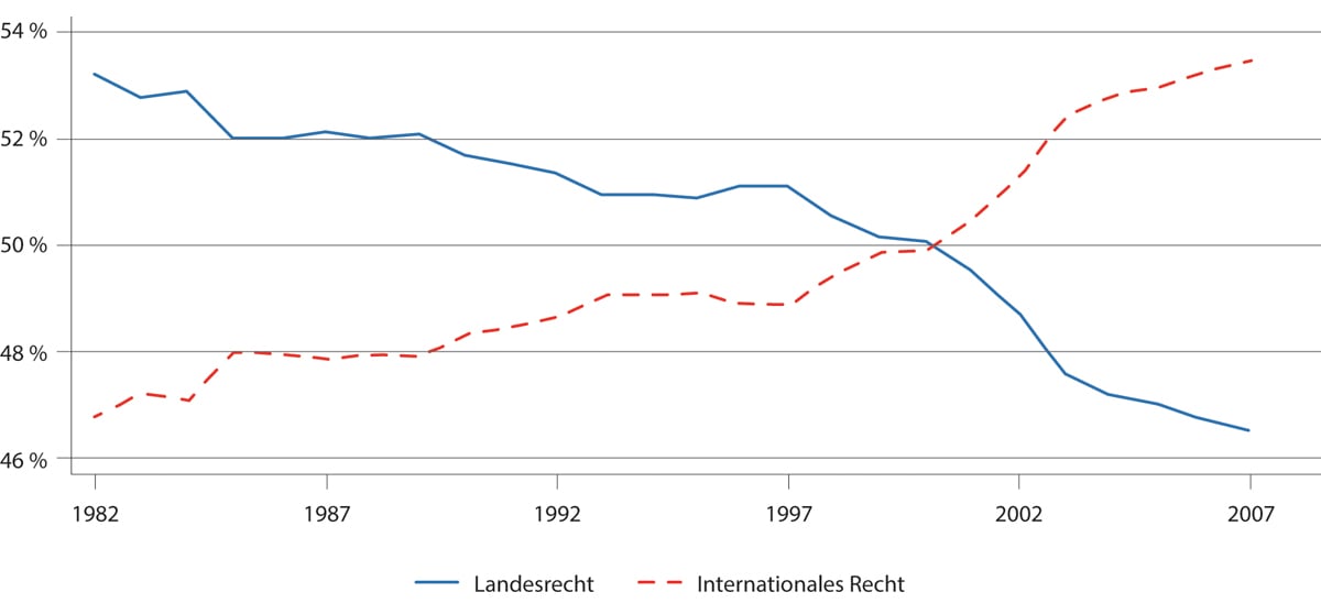 Figur 15.2 Andel av sveitsisk lovgivning med hhv. nasjonal (Landesrecht) og internasjonal (Internationales Recht) opprinnelse.
