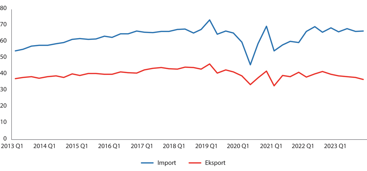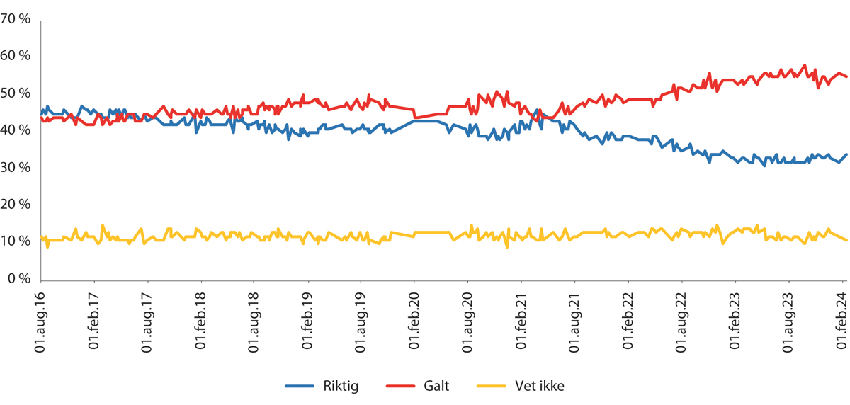Selv om det sveitsiske næringslivet i hovedsak har støttet en tett tilknytning mellom Sveits og EU, finnes det i Sveits, som i andre land, det som er blitt omtalt som «vinnere» og «tapere» på den økte samhandelen som har fulgt med EU-samarbeidet.31 Eksportnæringer som legemiddelindustri og høyteknologiske bedrifter, i tillegg til deler av tjenestesektoren, har oppnådd bedre tilgang til det europeiske markedet og økt konkurransedyktighet – og har vært sterke tilhengere av tettere integrasjon mot det indre marked. I deler av landbruket og i små-skala industrien som tidligere har produsert primært for hjemmemarkedet, og som gjennom liberalisering av samhandelen med EU har opplevd økt konkurranse, har skepsisen vært større.32 I tråd med dette har viktige eksportnæringer lagt press på den sveitsiske regjeringen for tettere samarbeid med EU, mens andre har vært mer skeptiske til økt integrasjon i det indre marked. EU-skepsisen har også ikke minst en geografisk dimensjon – distriktene har vært mer EU-skeptiske enn byene, og de franskspråklige delene av Sveits har vært mer EU-positive enn de tyskspråklige. Tendensen er samtidig at skepsisen til EU-medlemskap generelt har økt over tid, mens støtten til det bilaterale samarbeidet med EU har vært stabilt høy.33