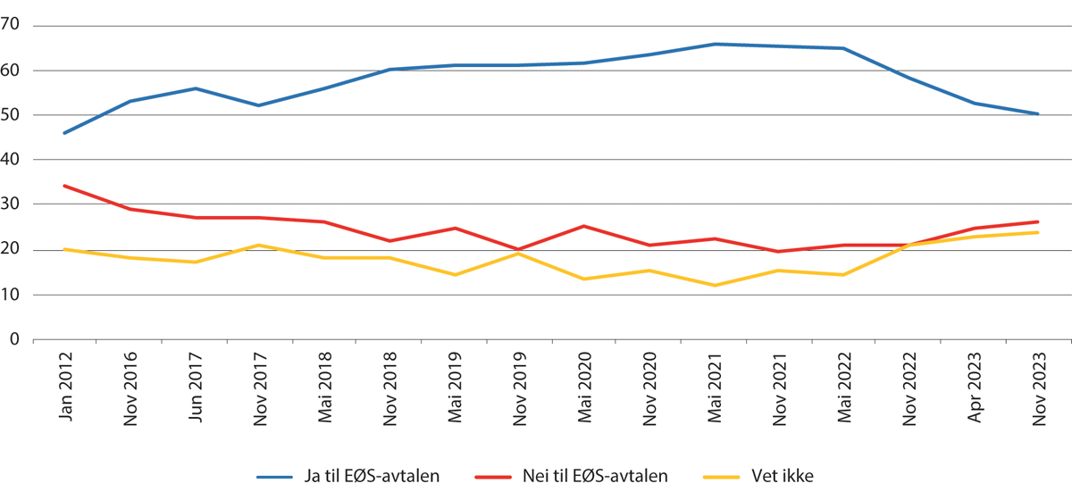 Figur 7.1 «Dersom det skulle være folkeavstemming om EØS-avtalen i morgen, ville du da stemt …». Svar på meningsmålinger, januar 2012-november 2023. Prosent.