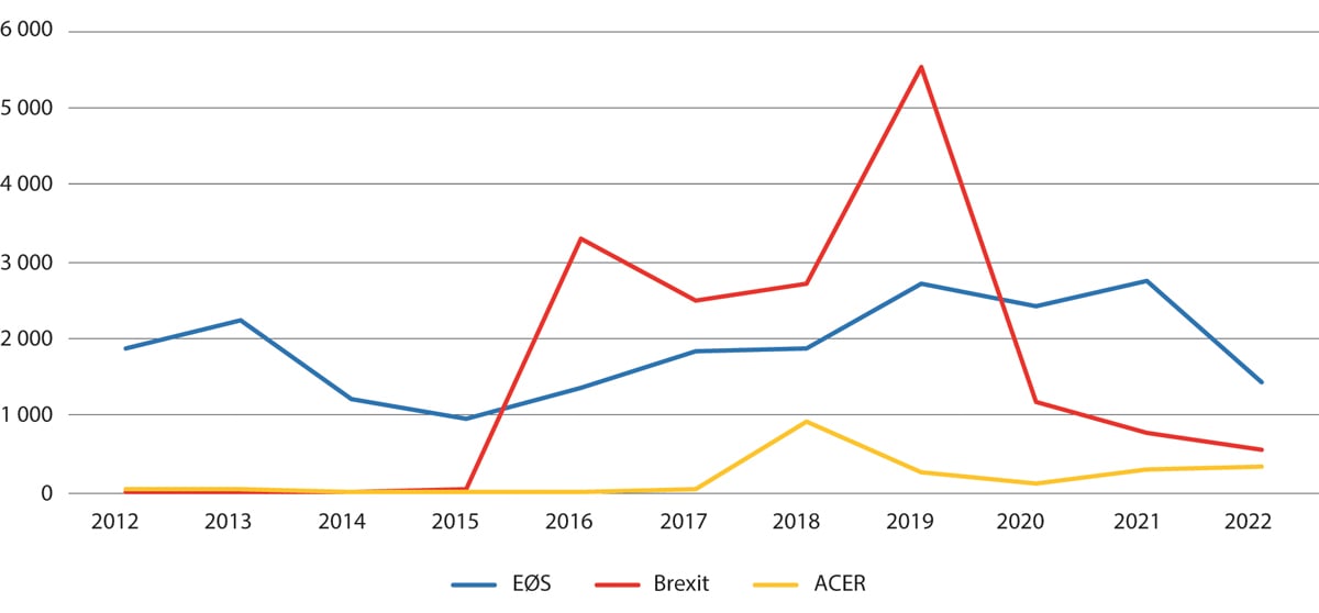 Figur 7.2 Antallet artikler som nevner EØS-avtalen, brexit og ACER, 2012–2022.