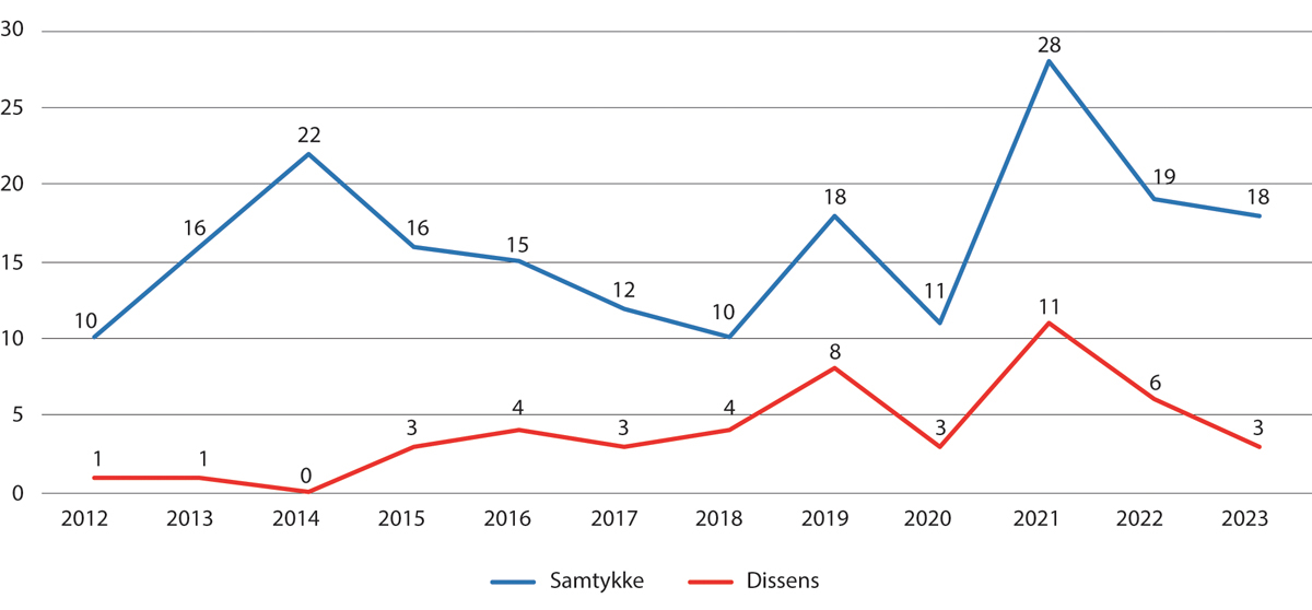 Figur 7.3 Antallet samtykkesaker og dissenser, 2011–2023.1