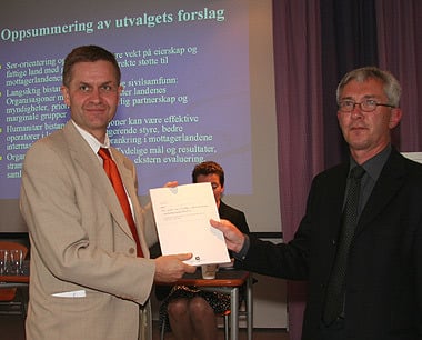 Utviklingsminister Erik Solheim (tv) får overlevert rapporten av utvalgsleder Jørn Rattsø. Foto: Pierre de Brisis, UD