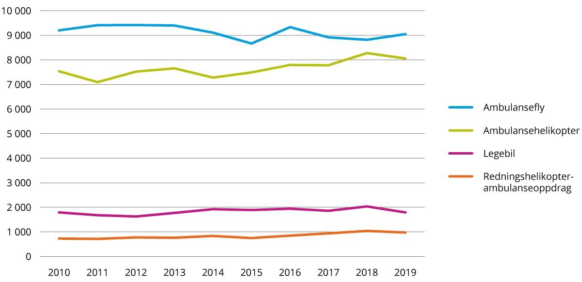 Helikoptrene utgjør den spisseste enden prehospitalt, og tilbyr avansert medisinsk behandling hos pasienten, og under transport. Oppdragene har ofte høy hastegrad. Ambulansehelikoptrene utfører flest primæroppdrag. Andelen sekundæroppdrag varierer mellom basene. Utvikling av oppdragstyper over tid kan reflektere utviklingstrekk innen sykehusstruktur, funksjonsfordeling, legevaktstruktur og innen den land- og sjøbaserte ambulansetjenesten. Bedre kompetanse i ambulansetjenesten, etablering av intensivambulanser og legebiler kan medføre redusert behov for legebemannet helikopterutrykning. Sentralisering av bilambulanse kan medføre flere helikopteroppdrag i distriktene (Helse Nord RHF, Helse Midt RHF, Helse Vest RHF, Helse Sør-Øst RHF, & Luftambulansetjenesten HF, 2018).