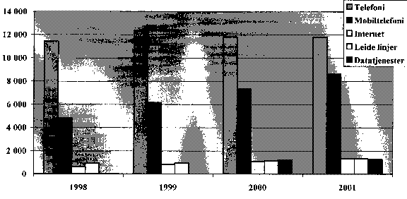 Omsetningen i det norske telemarkedet var anslagsvis ca. 24,3 mrd. kroner i 2001, mot ca. 22,7 mrd. kroner i 2000. Figur 2.1 viser utviklingen i omsetning i perioden 1998-2001 for delmarkedene fastnett telefontjeneste, mobiltelefontjeneste, overføringskapasitet, dataoverføringstjenester og Internet. De største områdene innenfor markedet er fastnett telefontjeneste (49 pst. av markedet i 2001) og mobilkommunikasjon (35 pst. av markedet i 2001).