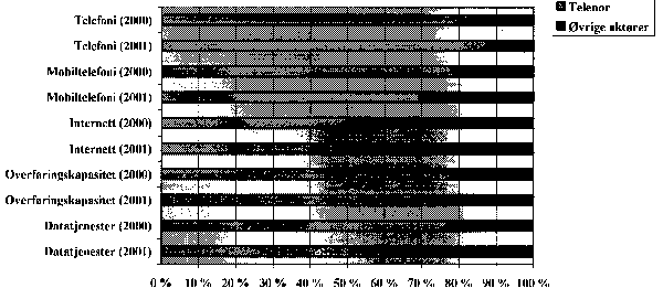 I Figur 2.2 gis det et anslag for hvordan markedsandelene for de forskjellige tjenestene var fordelt mellom Telenor og andre aktører i 2000 og 2001. Totalt sett er det anslått at Telenor første halvår 2002 hadde en markedsandel på 73 pst. av sluttbrukeromsetningen i det norske telemarkedet, hvilket innebærer at Telenors markedsandeler fortsatt er blitt redusert.