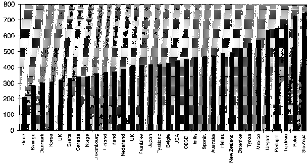 Figur 2.3 Årlige utgifter til fasttelefoni for privatkunder i OECD-land, ekskl. mva., samt OECD-gjennomsnitt august 2002 i US dollar, justert for ulikheter i kjøpekraft