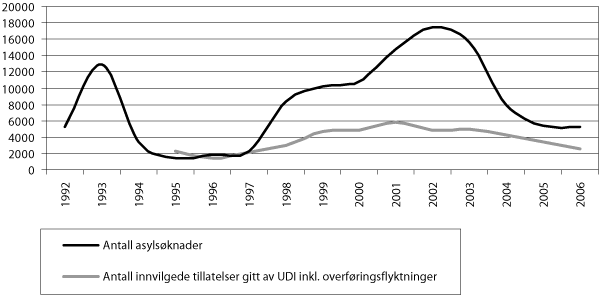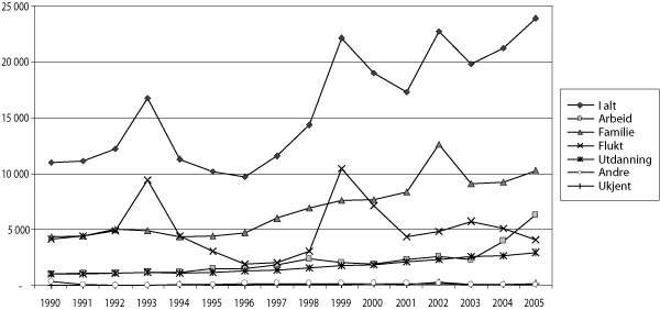 Figur 2.1 illustrerer utviklingen over tid. Økningen, med markerte svingninger i løpet av perioden, kommer klart fram. Toppene i 1993 og 1999 skyldes krigene i det tidligere Jugoslavia, mens toppen i 2002 i første rekke skyldes nedarbeiding av restanser i UDI, spesielt familiesaker. Figuren viser også at i 2005 var det for første gang i perioden flere arbeidsinnvandrere enn personer som fikk beskyttelse.