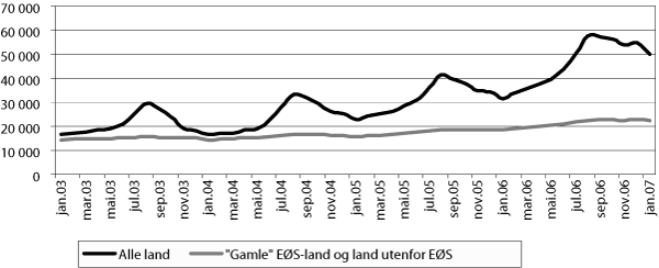 Figuren ovenfor viser den store økningen fra nye EU-land de siste par årene og illustrerer også de sesongmessige svingningene som fortsatt er markerte.