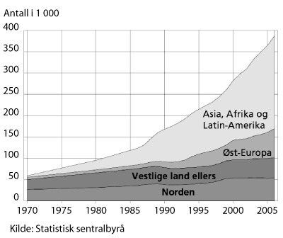 Figuren illustrerer at mesteparten av veksten i perioden skyldes innvandring fra land i Asia, Afrika og Latin-Amerika. I tillegg kommer en ikke ubetydelig innvandring fra land i Øst-Europa de siste 10–15 årene.