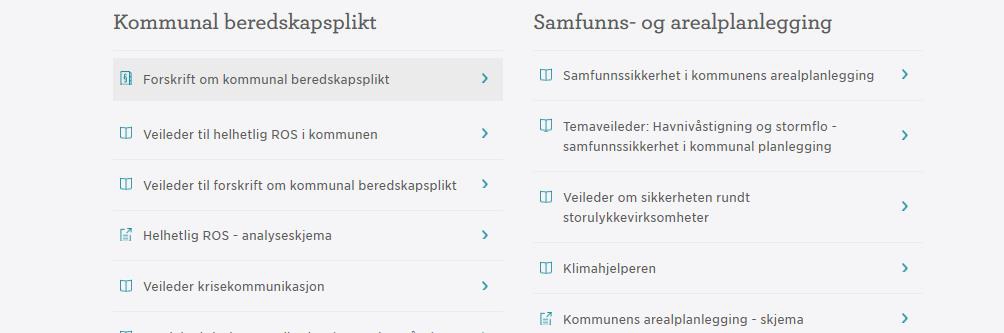 Direktoratet for samfunnssikkerhet og beredskap har en nettbasert veiledning om risiko, sårbarhet og beredskap knyttet til kommunenes beredskapsplikt og samfunns- og arealplanlegging. 22