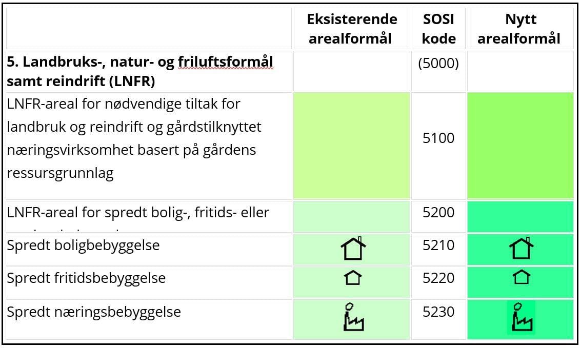 I kommuneplanens arealdel skal plankartet skille mellom eksisterende og nytt arealformål. Dette skillet gjør det synlig for høringspartene hvilke arealformål som allerede er stadfestet i tidligere vedtatt plan, og hvilke som er kommet inn som nye forslag i foreliggende plan. Fargene vist i figur 3.2 velges altså ikke på grunnlag av om det står bebyggelse der i dag eller ikke, men om det aktuelle området har vært vist med formålet LNFR spredt bebyggelse etter § 11-7 nr. 5 bokstav b) i tidligere vedtatt arealplan eller ikke. Endres størrelsen eller underformål på et område i forbindelse med revisjon av kommuneplanens arealdel vises den endrede delen med aktuell farge for nytt arealformål.