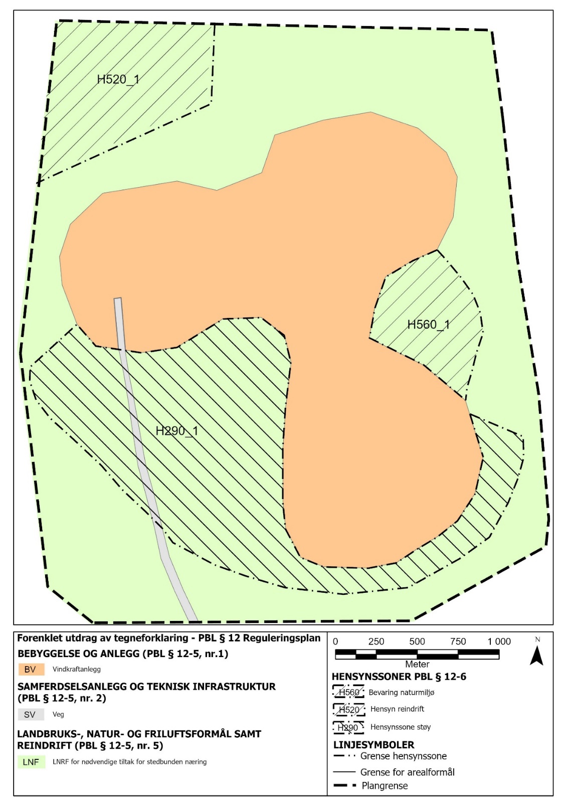 Internveger og nødvendig teknisk infrastruktur vises ikke i kommuneplanen, men inngår i formålet bebyggelse og anlegg. Detaljert utforming skal fastsettes i konsesjon og detaljplan etter energiloven. I kommuneplanen kan det fastsettes hensynssoner knyttet til støy, fare, og særlige hensyn knyttet til landbruk, reindrift, friluftsliv, grønnstruktur, landskap, naturmiljø, kulturmiljø eller randsoner til nasjonalpark eller landskapsvernområde. Det kan gis retningslinjer om begrensninger av virksomhet og vilkår for tiltak for å ivareta interessene i slike hensynssoner.