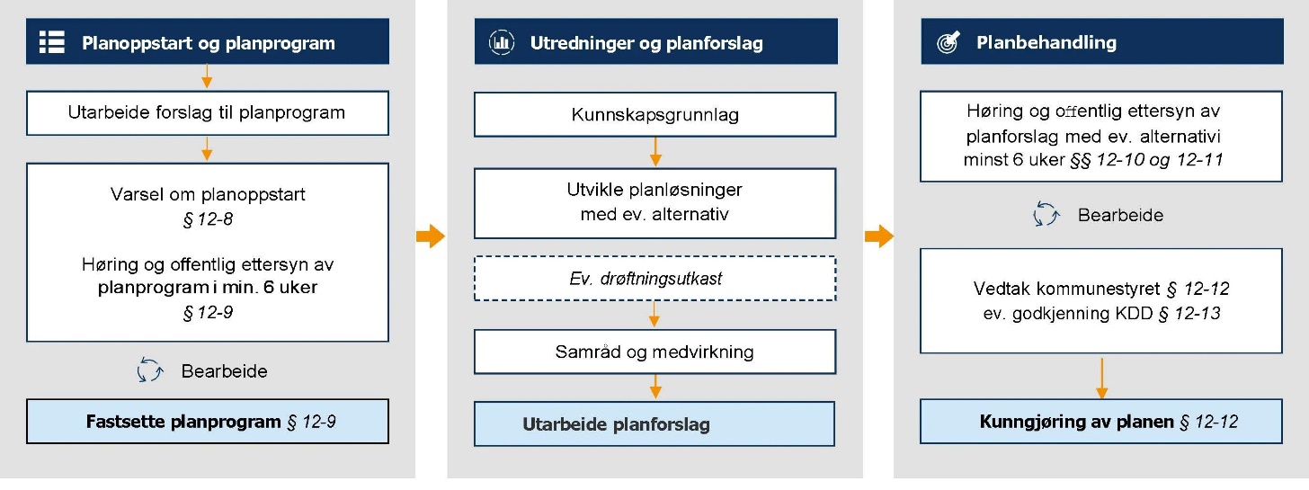 Planprosessen kan inndeles i tre hovedtrinn, se figuren under.