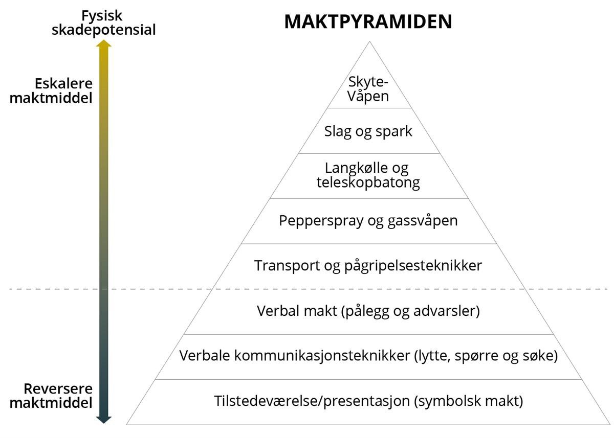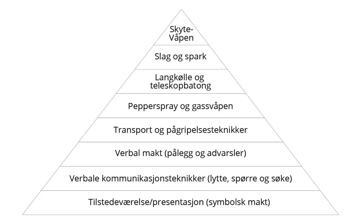 Ifølge mandatet skal utvalget «legge maktpyramiden grunn til i sitt arbeid». Maktpyramiden spiller dermed en sentral rolle og beskrives derfor nærmere her. Bevæpningsutvalget beskrev maktpyramiden som «en pedagogisk fremstilling av noen av de maktmidlene politiet har adgang til å benytte i sin tjenesteutførelse».39 NOU 2017:9 henviser i sin omtale av maktpyramiden til Lie og Lagestad (2011), som presenterte modellen i sin lærebok i arrestasjonsteknikk ved Politihøgskolen i 2007. Lie og Lagestad viste her til at maktbruken i pyramiden tar utgangspunkt i politilovens nødvendighets- og forholdsmessighetsprinsipp, og fremhevet at rangeringen bygger på kriterier der «det er av særlig betydning hvor mye fysisk og psykisk skade/ubehag som kan forventes på person ved bruk av de ulike maktmidlene».40 Videre understreket de at «maktpyramiden likevel bare er veiledende da konkrete trusselvurderinger og taktiske hensyn raskt kan bytte om på hvilket nivå maktmidlene hører hjemme».41 Lie og Lagestad skrev videre at «valg av virkemiddel og strategi bestemmes ut fra juridiske, taktiske, medisinske og etiske faktorer».42 Bevæpningsutvalget utdypet dette med at «Maktpyramiden viser til adgangen politiet har til å bruke makt, og i hvilket omfang (Politilovens § 6). Det overlates til den enkelte tjenesteperson, og vedkommendes skjønnsutøvelse, å finne det nødvendige, forholdsmessige og formålstjenlige nivået av maktutøvelse i den enkelte situasjon».43 I læreboken til Lie og Lagestad ble det videre trukket frem at «hver enkelt politibetjent må vurdere egen fysisk og psykisk styrke og ferdighetsnivå i forhold til personer i den enkelte situasjon».44