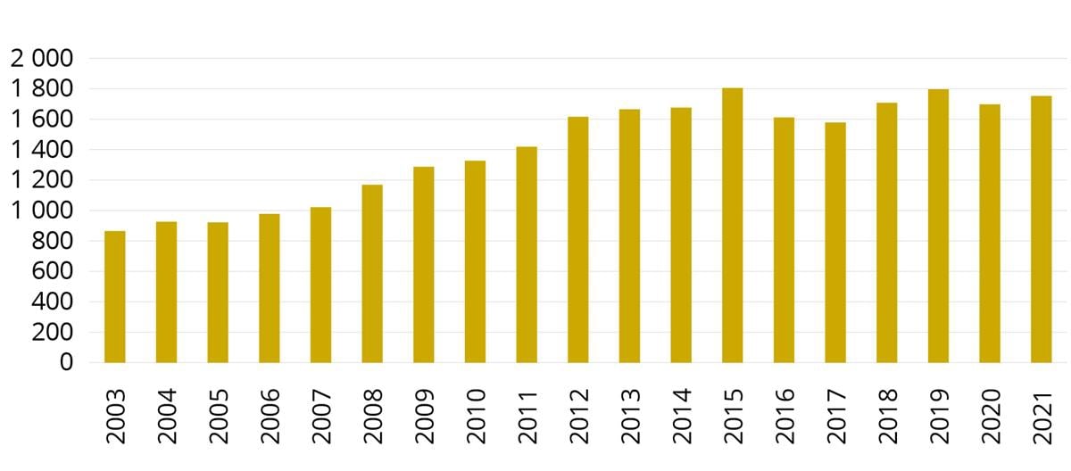 Tall fra statistikkbanken til SSB viser at anmeldelser av vold og trusler mot offentlig tjenesteperson økte gradvis fra 865 i året i 2003, til 1805 i året i 2015 (figur 11).141 I perioden etter 2015 viser tallgrunnlaget som ligger til grunn for figur 11, at anmeldte vold og trusler mot offentlig tjenesteperson har vært forholdsvis stabilt på mellom 1600 og 1800 anmeldelser i året.